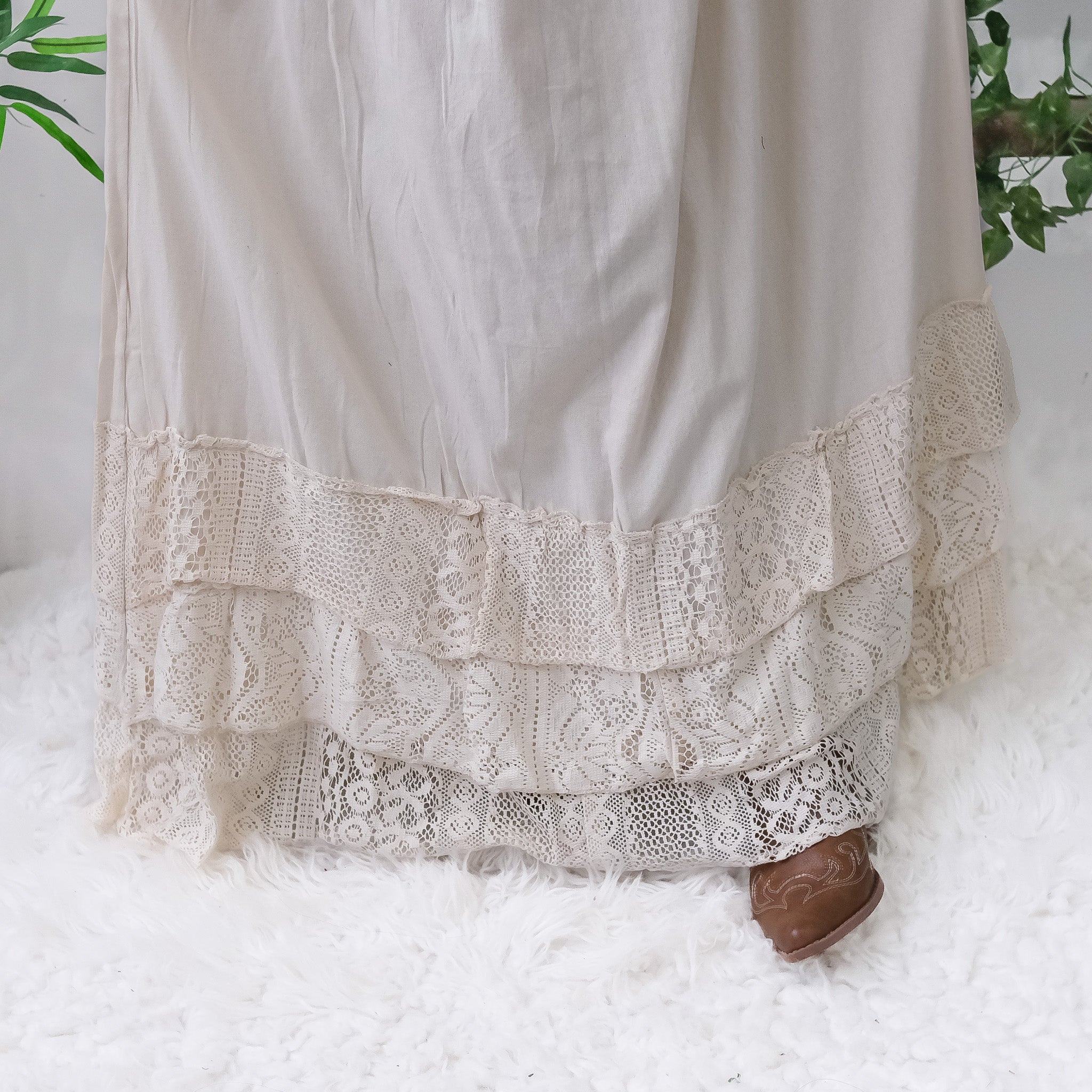 Designed for comfort and movement, it features a stretchy elastic waistband, adjustable drawstring, and deep side pockets—because convenience should always be cute. The layered lace hem adds a touch of rustic charm, giving the skirt a timeless cottagecore and prairie-inspired look.