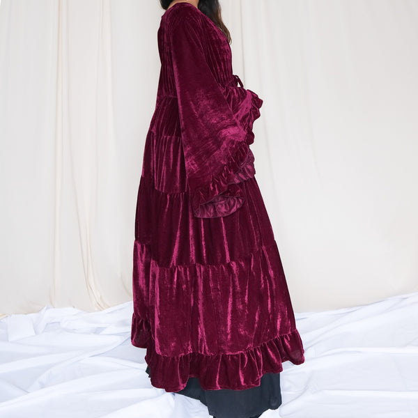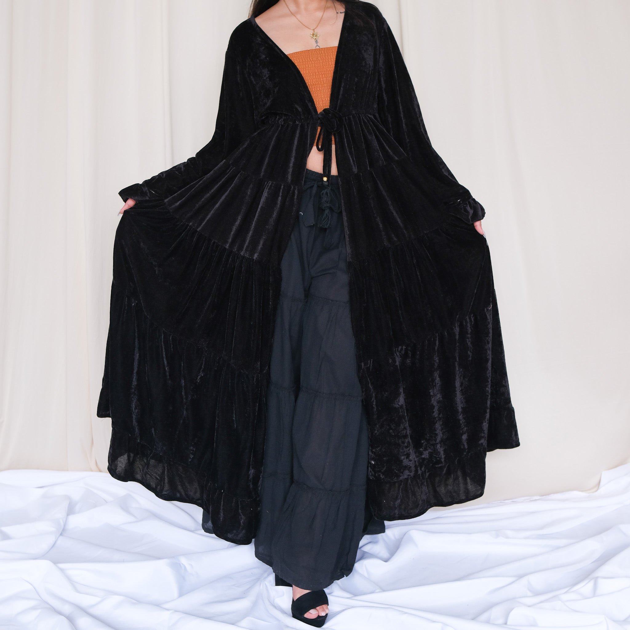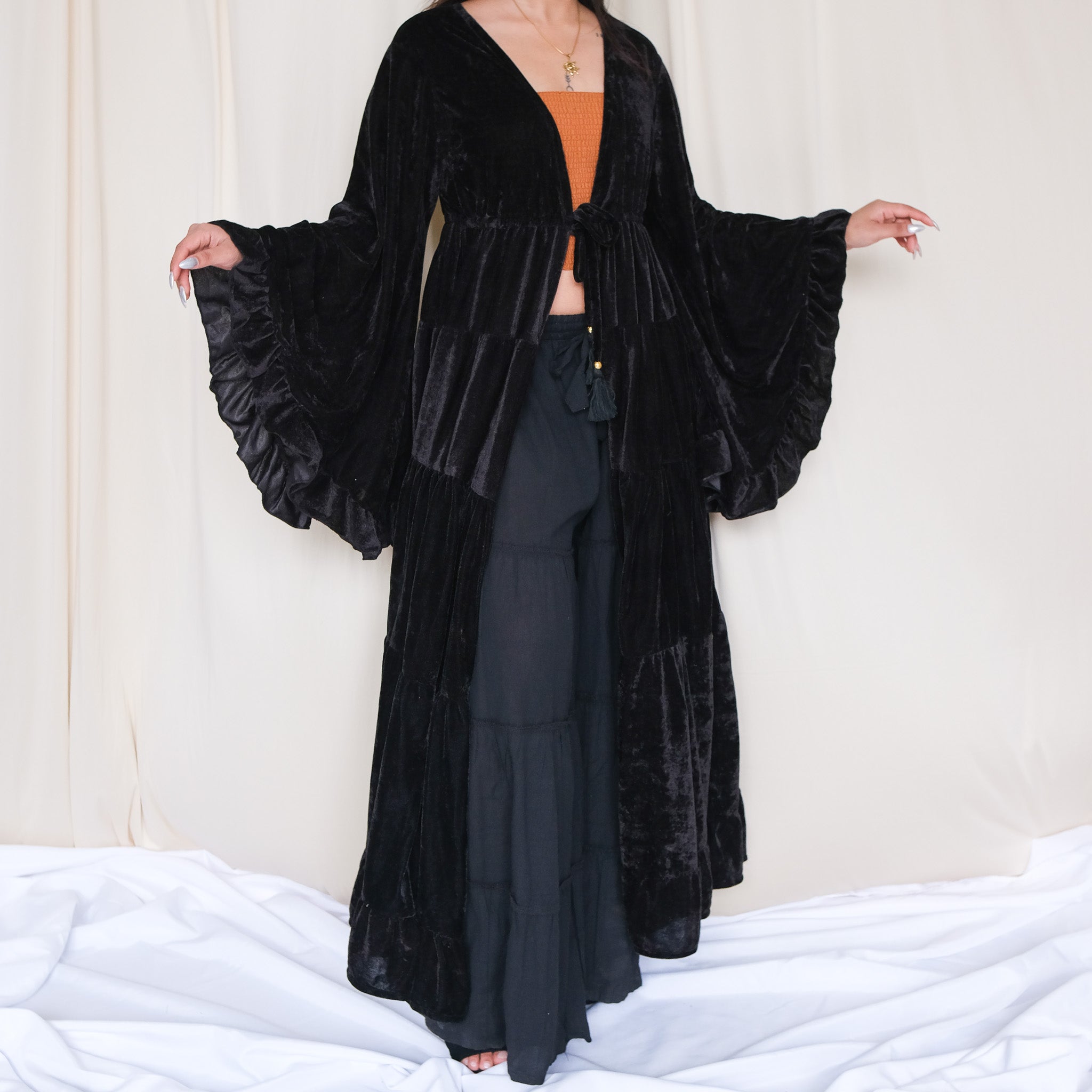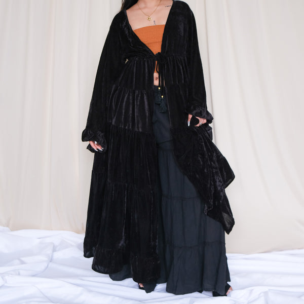 Wrap yourself in magic with our Bohemian Velvet Goddess Maxi Duster – a flowing statement piece designed for dreamers, wanderers, and old souls. Crafted from luxuriously soft velvet, this robe features dramatic bell sleeves, a tiered skirt, and a floor-sweeping silhouette that moves gracefully with every step. Its open front with tie closure makes it perfect for layering, whether over a simple outfit, festival attire, or an elegant gown.