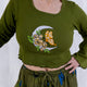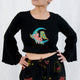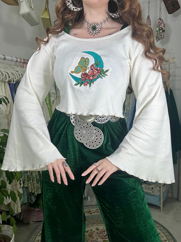 Expertly hand-embroidered with celestial and butterfly prints on ribbed organic cotton, this stretchy crop top is perfect for sustainable and free-spirited fashionistas. The bell sleeves add a touch of whimsigoth and goth vibes, while providing comfort and breathability as a fall and winter sweater.
